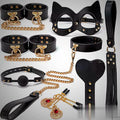 This kit comes with 8 different items including 2 handcuffs, 2 ankle cuffs, a flogger, a choker and leash combo, spanker, face mask, 2 nipple clamps, and a mouth gag.